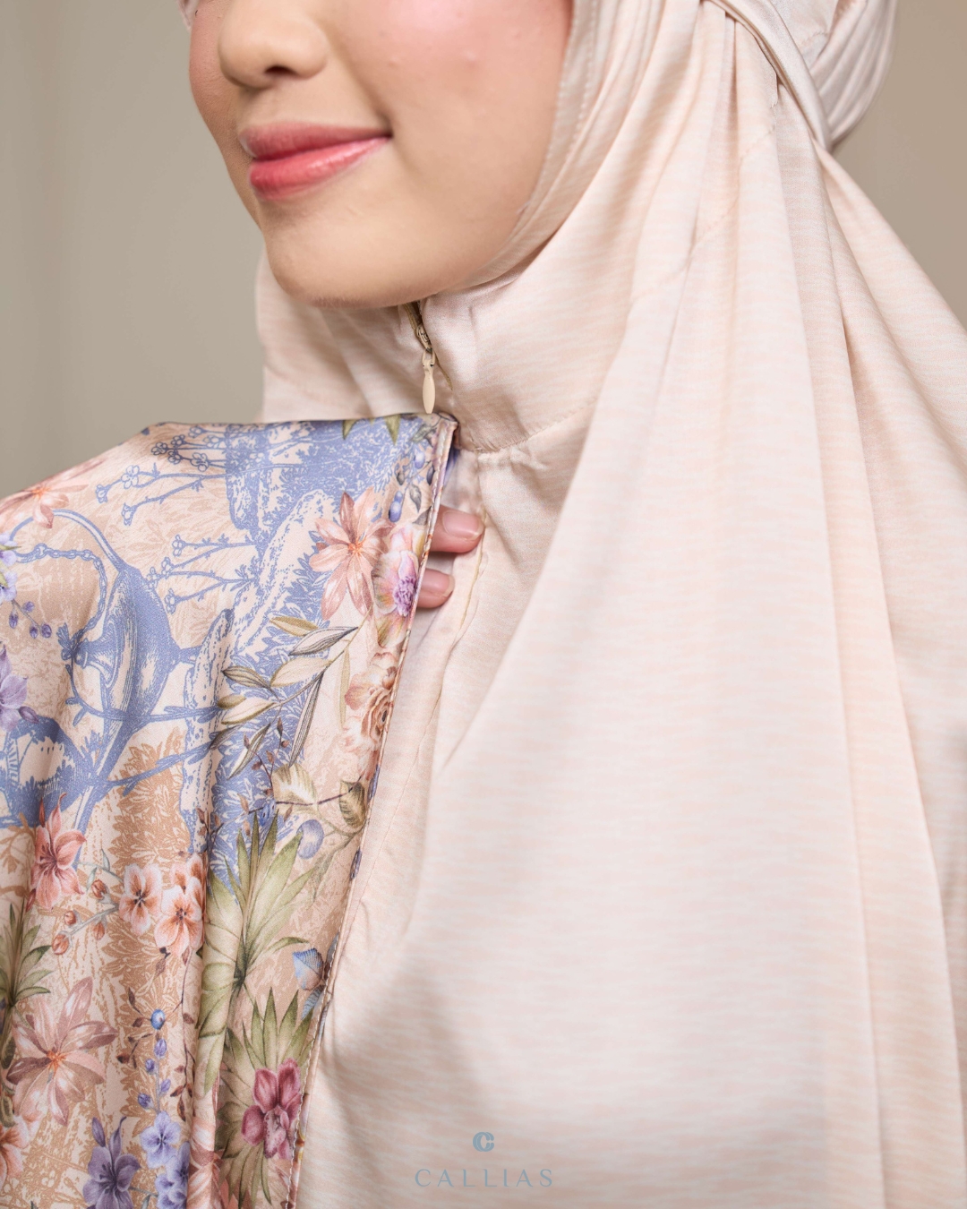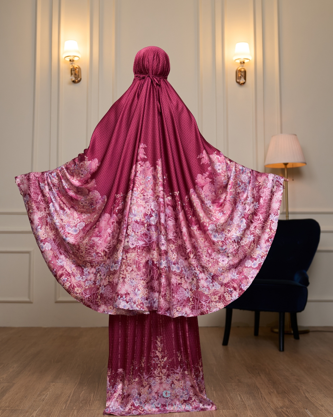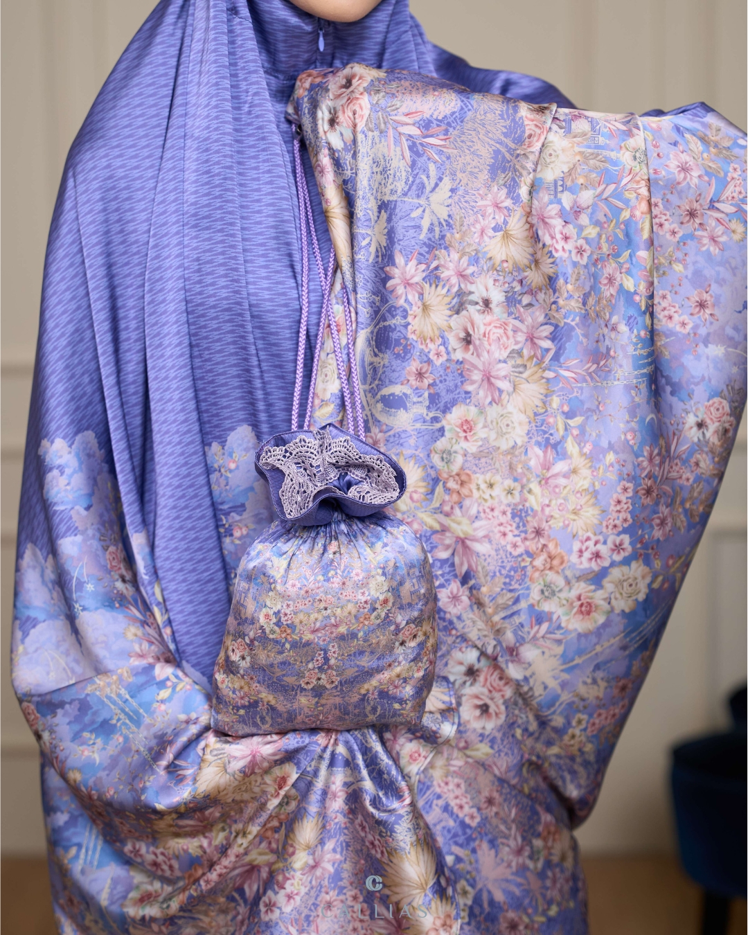 Prayer Set robe Callias menggunakan bahan Elenoir Silk yang berbahan ringan, lembut dan flowy. Menggunakan zipper di bagian dagu sehingga dapat dipakai dengan dua style berbeda.